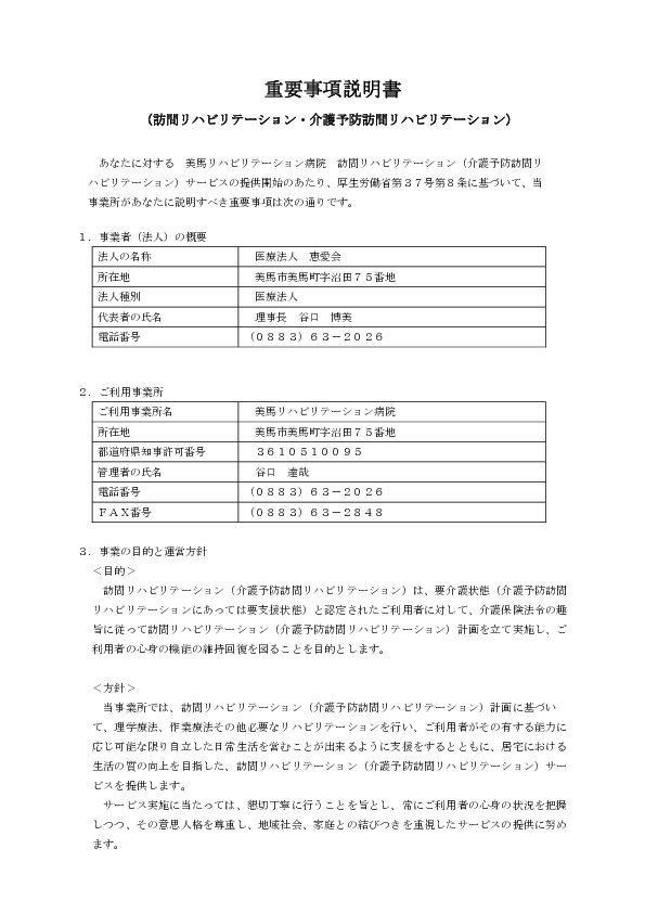 1.患者様の権利を尊重し、スタッフの一人一人が研鑚意欲を持ち、常に向上心を抱き、質の高いサービスを提供します。2.患者・家族が希望するリハビリテーションが受けられ、人間性を重視し、この事業所を利用して良かったと思っていただけるよう全職員がサポートします。